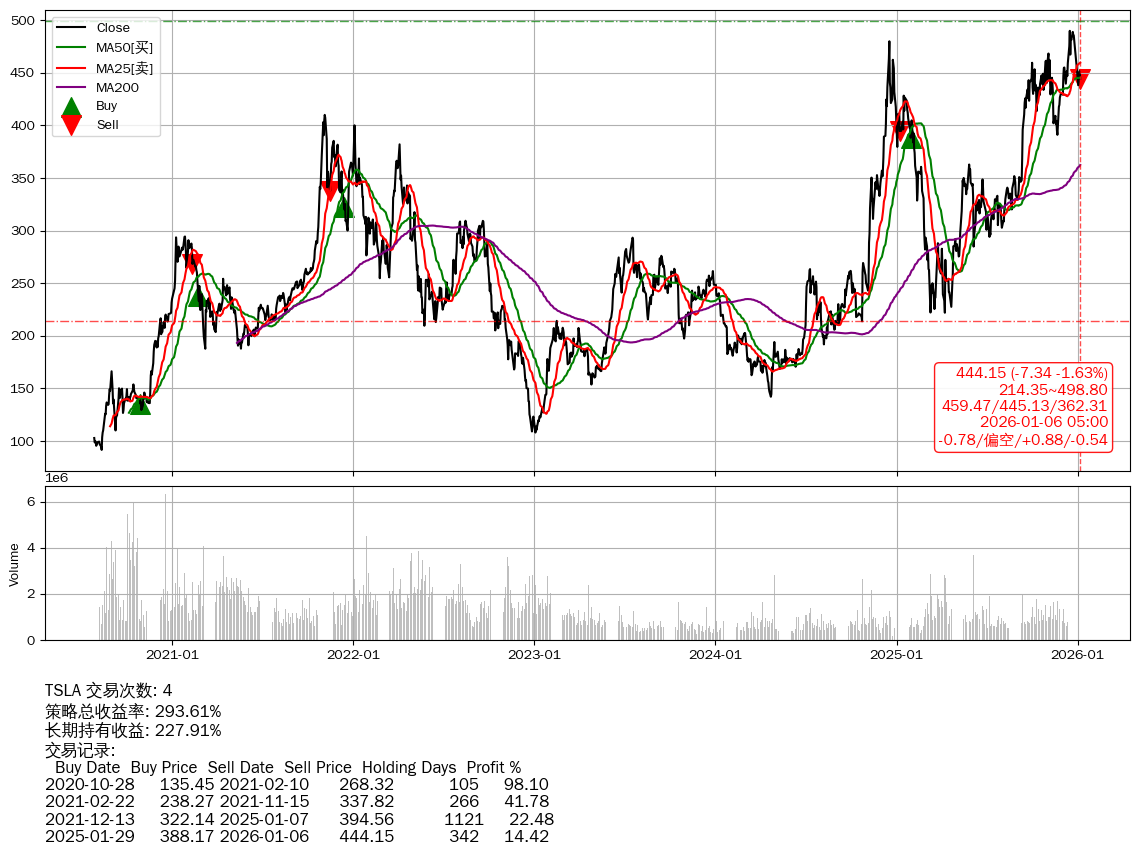 | 7 | ★TSLA | $432.49(-19.20 -4.25%) 01-06 14:56 451.69 01-05 | 📉跌破 MA5/50 均线 📉回撤 2025-12-16 -9.32% (20天) 489.79(2025-12-15)→438.10(01-01) | +293.61% | +227.91% | +65.70% | 4 | 偏空/0.88/-0.54 | 2020-07-27~2026-01-06 |