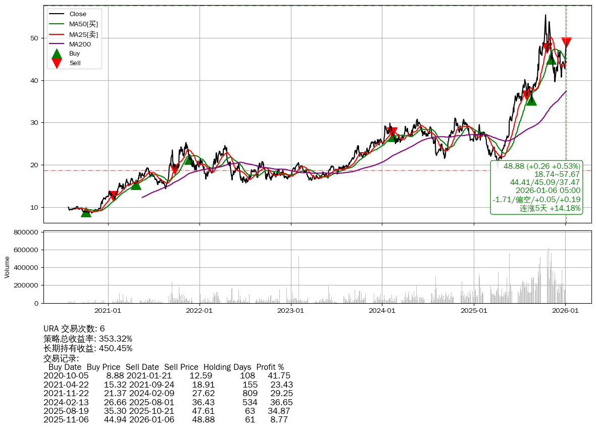 | 6 | ★URA | $49.45(+0.83 +1.71%) 01-06 14:56 48.62 01-05 | 📈连涨5天 +14.18% 📉回撤 2025-10-15 -11.88% (82天) 55.47(2025-10-14)→39.63(2025-11-20) | +353.32% | +450.45% | -97.13% | 6 | 偏空/0.05/0.19 | 2020-07-27~2026-01-06 |