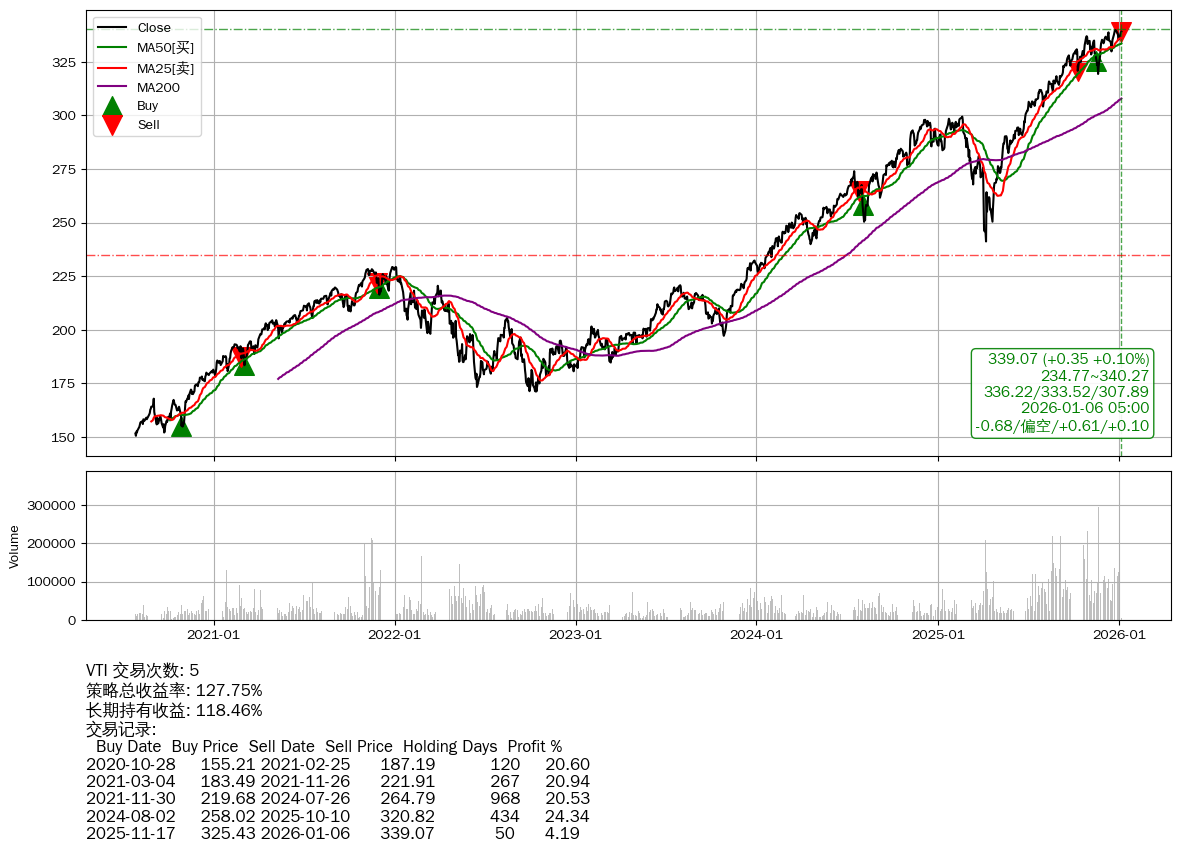 | 22 | ★VTI | $341.29(+2.45 +0.72%) 01-06 14:56 338.84 01-05 | 📉回撤 2025-12-25 -0.23% (11天) 339.84(2025-12-23)→335.26(2025-12-30) | +127.75% | +118.46% | +9.29% | 5 | 偏空/0.61/0.10 | 2020-07-27~2026-01-06 |