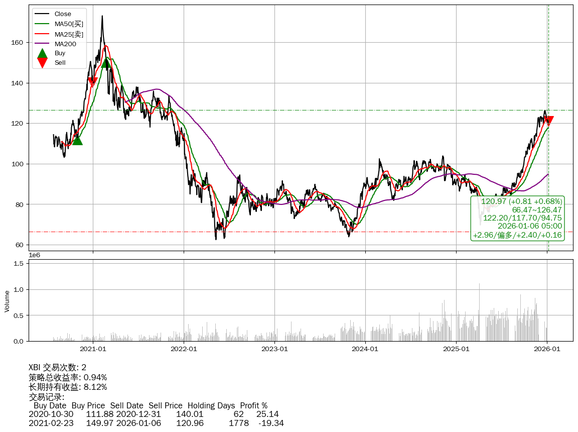 | 38 | ★XBI | $122.11(+1.94 +1.61%) 01-06 14:59 120.17 01-05 | 📉回撤 2021-02-08 -30.09% (1792天) 173.03(2021-02-07)→62.39(2022-05-10) | +0.94% | +8.12% | -7.18% | 2 | 偏多/2.4/0.16 | 2020-07-27~2026-01-06 |