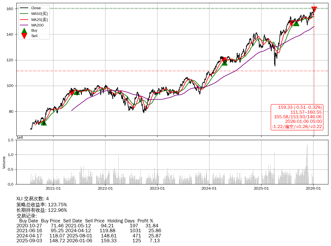 | 25 | ★XLI | $162.01(+2.18 +1.36%) 01-06 14:56 159.84 01-05 | 📉回撤 01-05 -0.32% (0天) 159.84(01-04)→159.33(01-05) | +123.75% | +122.96% | +0.79% | 4 | 偏空/0.28/0.22 | 2020-07-27~2026-01-06 |