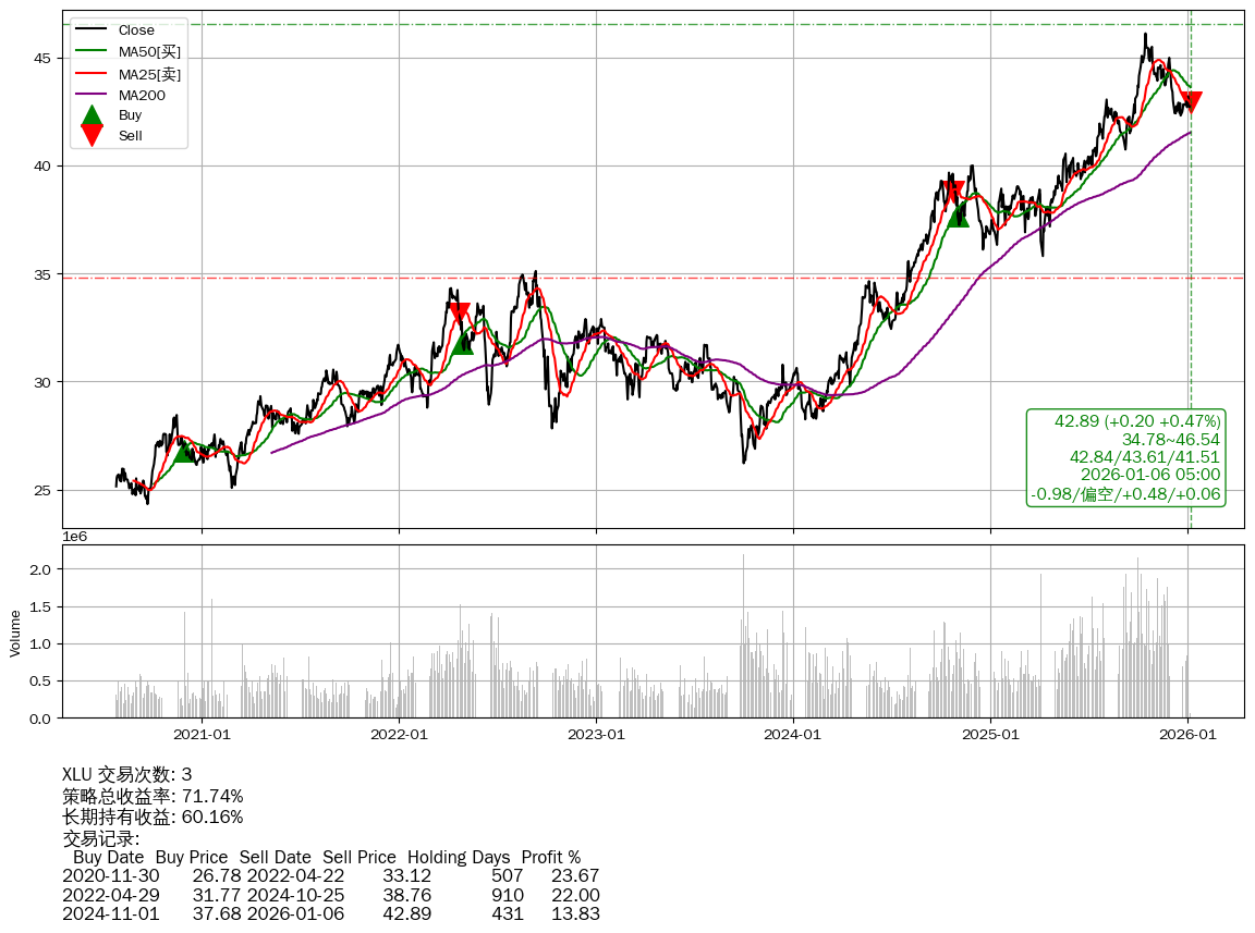| 29 | ★XLU | $42.94(+0.25 +0.59%) 01-06 14:56 42.69 01-05 | 📈涨破 MA5/10/25 均线 📉回撤 2025-10-15 -6.96% (82天) 46.10(2025-10-14)→42.30(2025-12-18) | +71.74% | +60.16% | +11.59% | 3 | 偏空/0.48/0.06 | 2020-07-27~2026-01-06 |