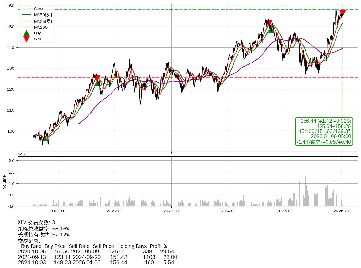 | 31 | ★XLV | $158.14(+3.10 +2.00%) 01-06 14:56 155.04 01-05 | 📈涨破 MA5/10 均线 📉回撤 2025-11-25 -1.04% (41天) 158.09(2025-11-24)→149.34(2025-12-08) | +68.16% | +62.12% | +6.04% | 3 | 偏空/0.08/0.40 | 2020-07-27~2026-01-06 |