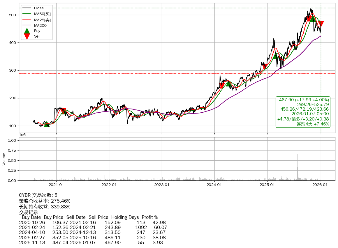 | 9 | 🟢CYBR | $467.80(+18.45 +4.11%) 01-07 14:59 449.35 01-06 | 📈涨破 MA10/25 均线 📈连涨4天 +7.46% 📉回撤 2025-10-28 -10.43% (70天) 522.40(2025-10-27)→435.41(01-01) | +275.46% | +339.88% | -64.42% | 5 | 偏多/3.2/0.38 | 2020-07-27~2026-01-07 |