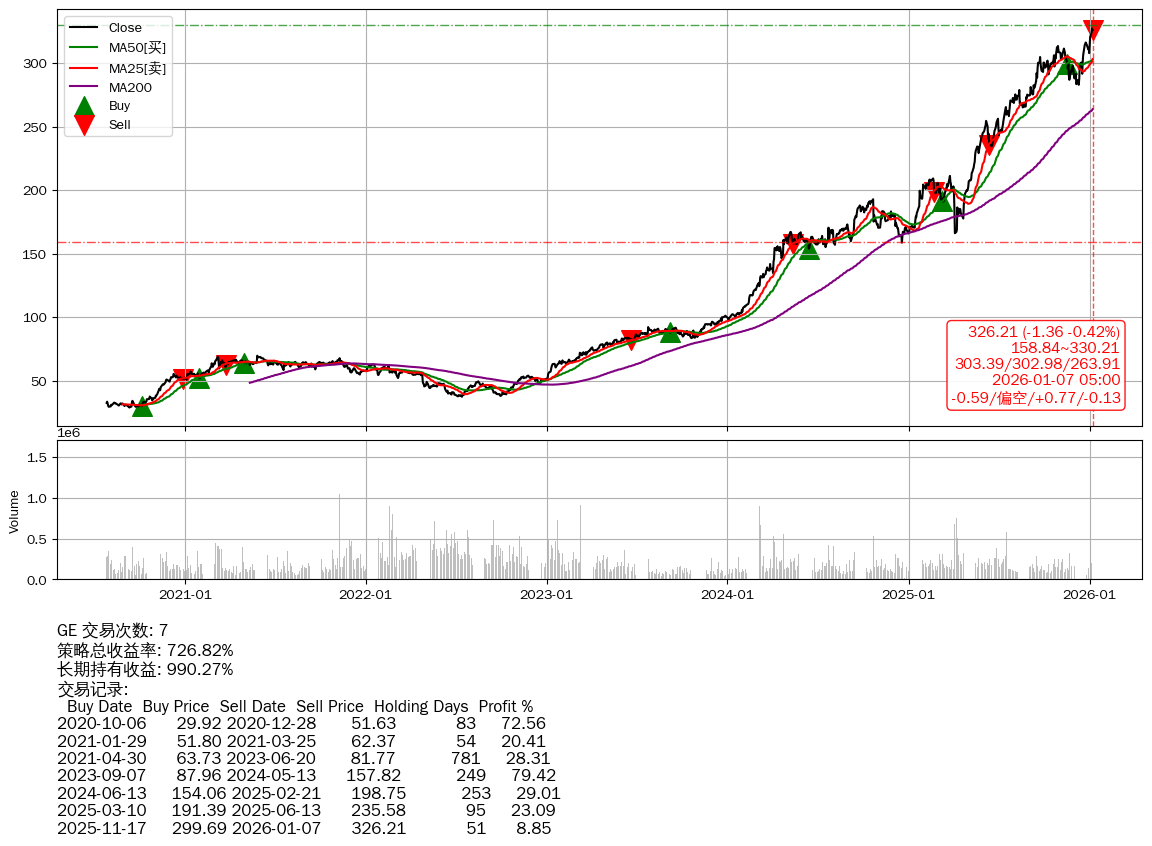 | 4 | ★GE | $323.61(-3.96 -1.21%) 01-07 14:59 327.57 01-06 | 📉回撤 01-06 -0.42% (0天) 327.57(01-05)→326.21(01-06) | +726.82% | +990.27% | -263.46% | 7 | 偏空/0.78/-0.13 | 2020-07-27~2026-01-07 |