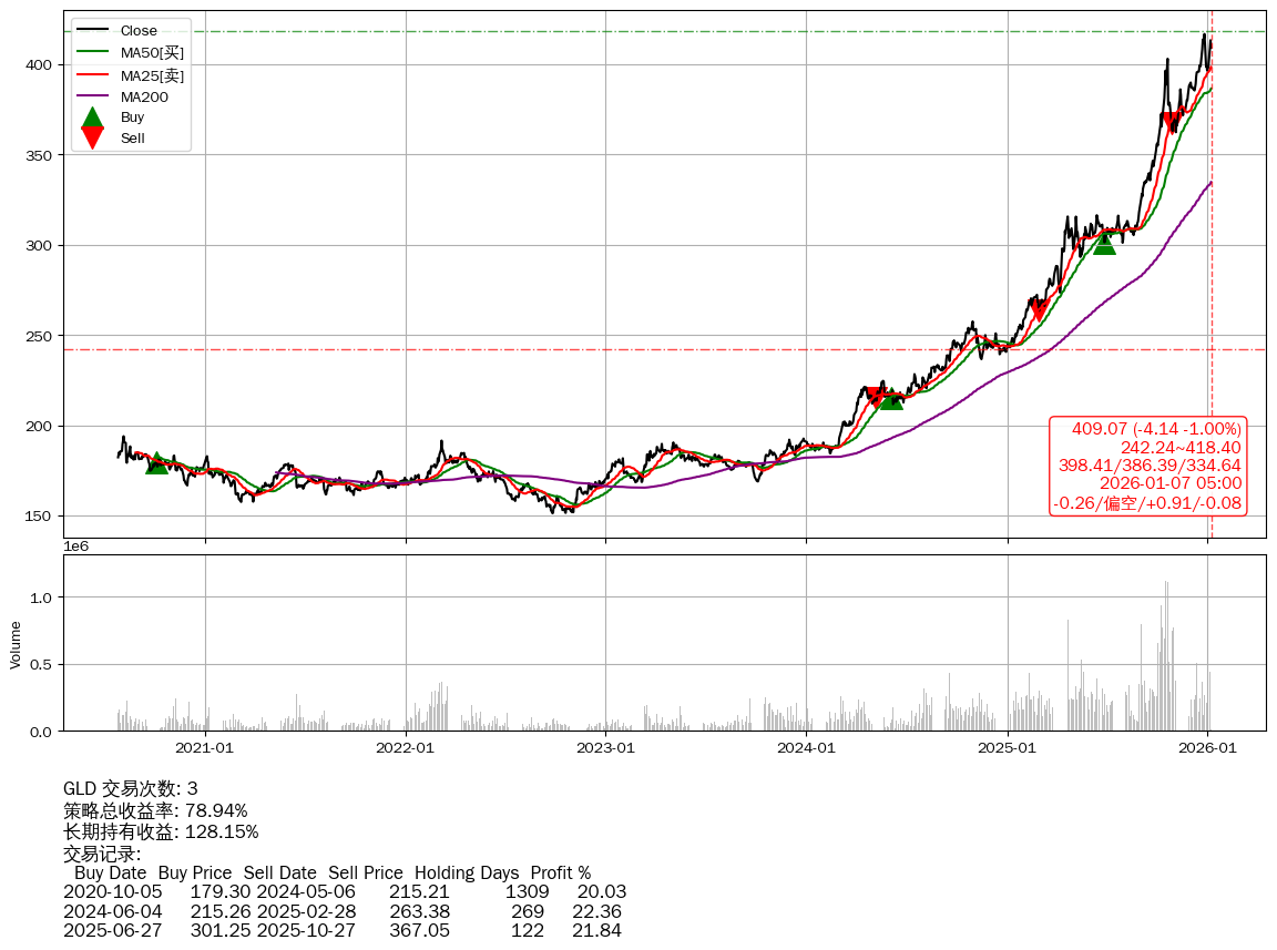 | 29 | ★GLD | $409.23(-4.10 -0.99%) 01-07 14:59 413.33 01-06 | 📉回撤 2025-12-28 -1.82% (9天) 416.67(2025-12-25)→396.35(2025-12-30) | +78.94% | +128.15% | -49.20% | 3 | 偏空/0.91/-0.08 | 2020-07-27~2026-01-07 |