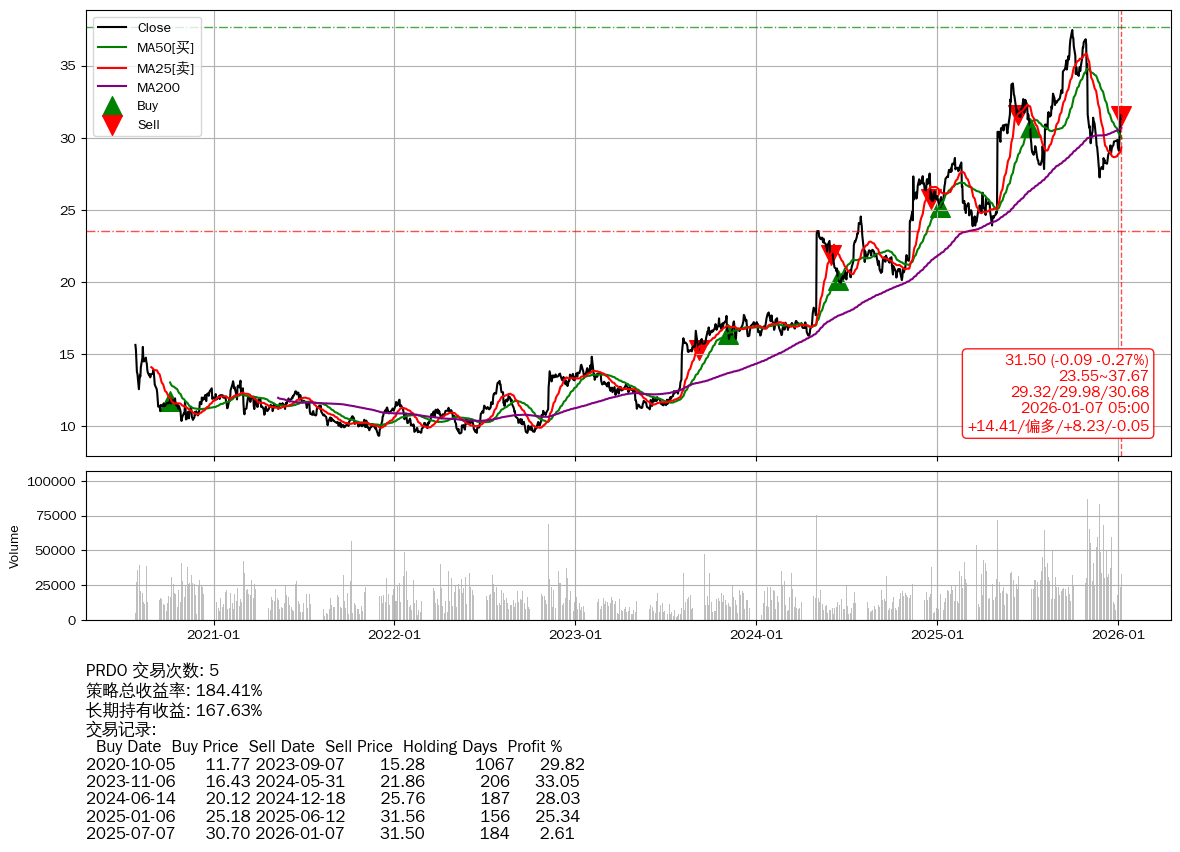 | 14 | PRDO | $31.48(-0.05 -0.16%) 01-07 14:59 31.53 01-06 | 📉回撤 2025-09-30 -15.93% (98天) 37.47(2025-09-29)→27.25(2025-11-23) | +184.41% | +167.63% | +16.78% | 5 | 偏多/8.23/-0.05 | 2020-07-27~2026-01-07 |