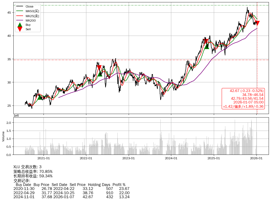 | 31 | ★XLU | $41.85(-1.09 -2.54%) 01-07 14:59 42.94 01-06 | 📉跌破 MA5/10/25 均线 📉回撤 2025-10-15 -7.44% (83天) 46.10(2025-10-14)→42.30(2025-12-18) | +70.85% | +59.34% | +11.52% | 3 | 偏多/1.89/-0.36 | 2020-07-27~2026-01-07 |