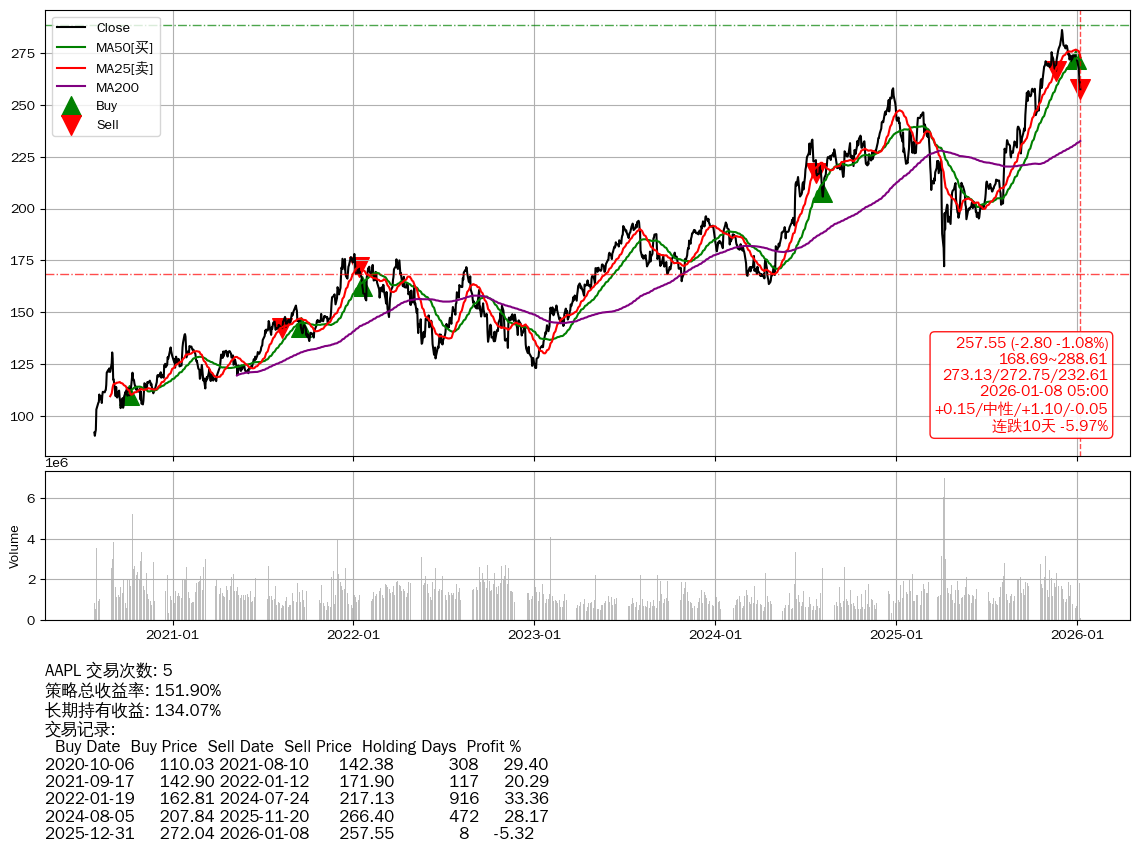 | 19 | ★AAPL | $259.06(-1.30 -0.50%) 01-08 14:59 260.36 01-07 | 📉跌破 MA100 均线 📉连跌10天 -5.97% 📉回撤 2025-12-02 -9.98% (36天) 286.09(2025-12-01)→257.55(01-07) | +151.90% | +134.07% | +17.83% | 5 | 中性/1.1/-0.05 | 2020-07-27~2026-01-08 |