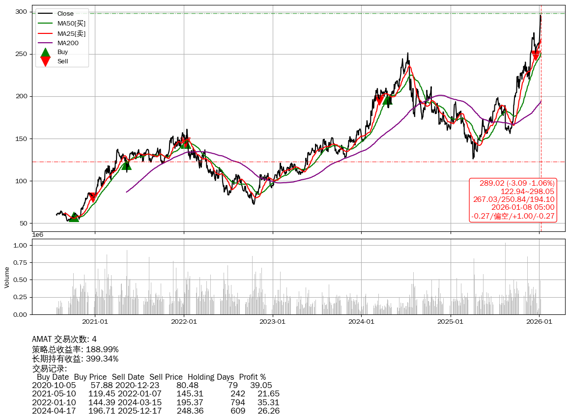 | 13 | ★AMAT | $281.58(-10.62 -3.63%) 01-08 14:59 292.20 01-07 | 📉回撤 01-06 -2.30% (1天) 295.82(01-05)→289.02(01-07) | +188.99% | +399.34% | -210.36% | 4 | 偏空/1.0/-0.27 | 2020-07-27~2026-01-08 |
