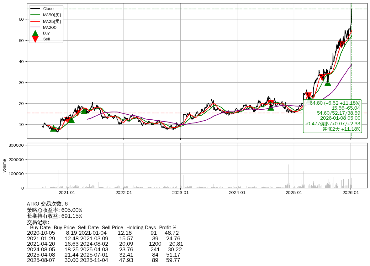 | 5 | 🟢ATRO | $64.85(+6.60 +11.33%) 01-08 14:59 58.25 01-07 | 📈涨破 MA5 均线 📈涨破 52周高点 (65.04) 📈连涨2天 +11.18% | +605.00% | +691.15% | -86.15% | 6 | 偏多/0.07/2.33 | 2020-07-27~2026-01-08 |