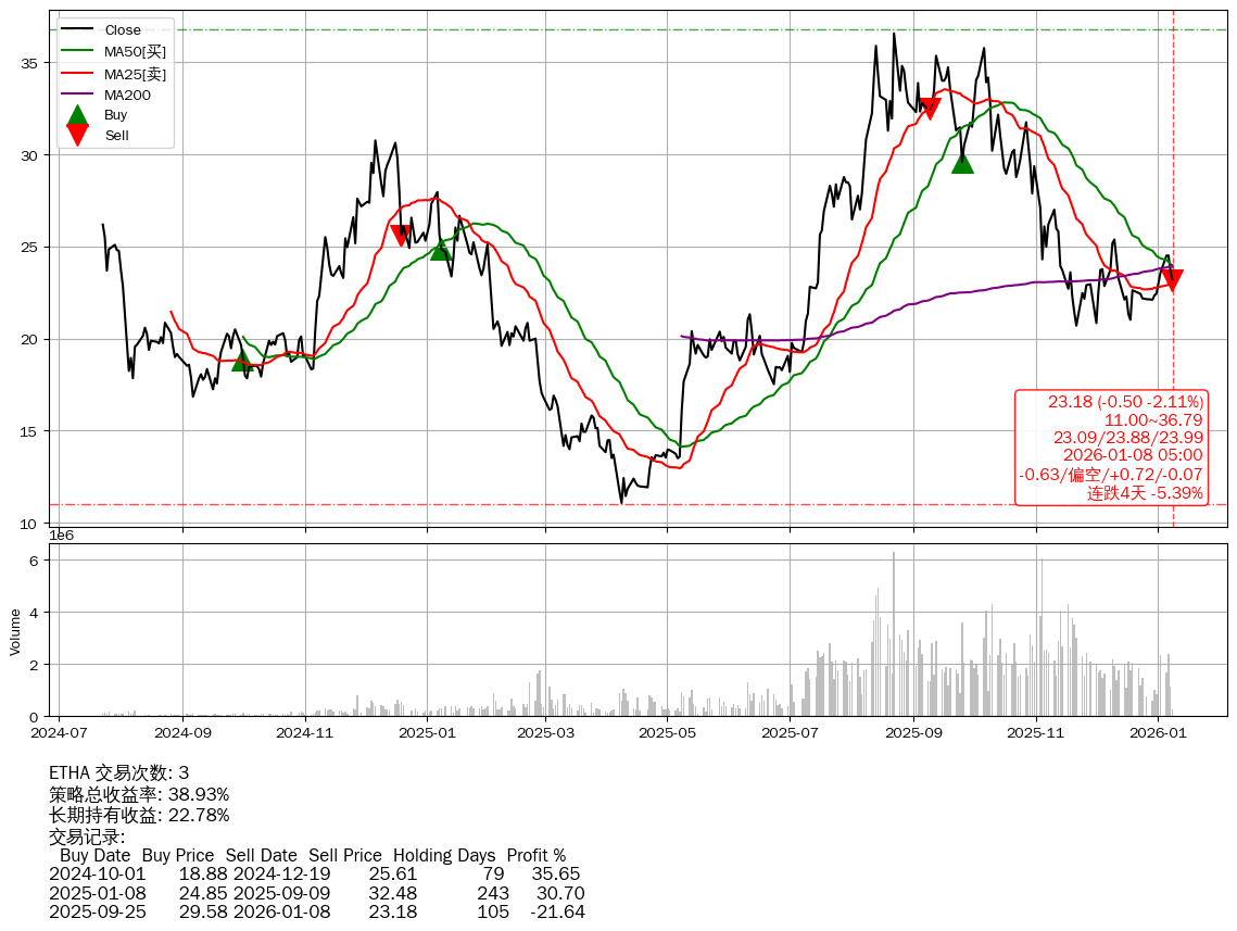 | 37 | ★ETHA | $23.43(-0.25 -1.06%) 01-08 14:59 23.68 01-07 | 📉连跌4天 -5.39% 📉回撤 2025-08-24 -36.63% (136天) 36.58(2025-08-21)→20.70(2025-11-20) | +38.93% | +22.78% | +16.15% | 3 | 偏空/0.72/-0.07 | 2024-07-23~2026-01-08 |