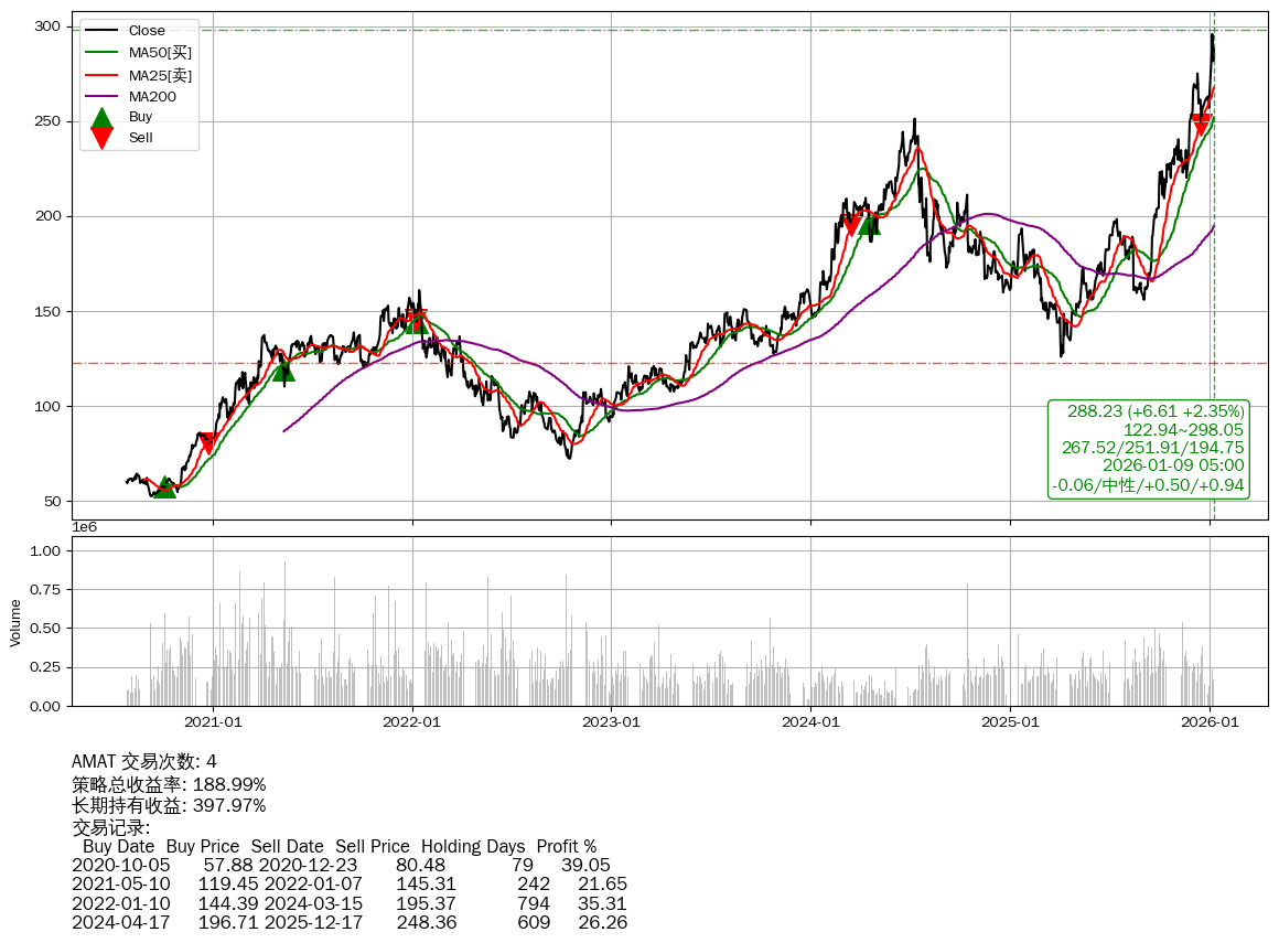 | 12 | ★AMAT | $301.11(+19.53 +6.94%) 01-09 14:59 281.58 01-08 | 📉回撤 01-06 -2.57% (2天) 295.82(01-05)→281.62(01-07) | +188.99% | +397.97% | -208.98% | 4 | 中性/0.5/0.94 | 2020-07-27~2026-01-09 |