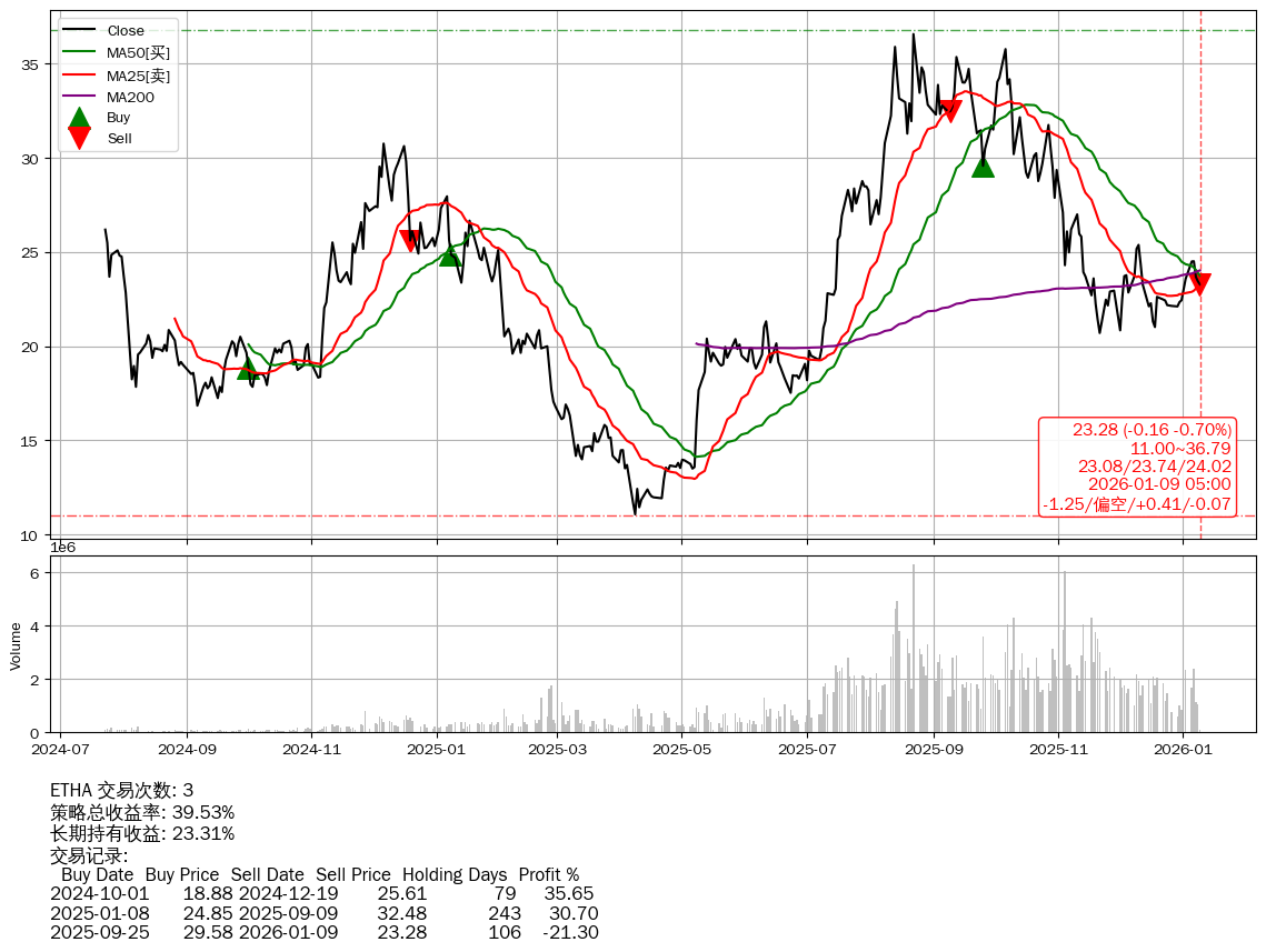 | 36 | ★ETHA | $23.19(-0.24 -1.02%) 01-09 14:59 23.43 01-08 | 📉回撤 2025-08-24 -36.36% (137天) 36.58(2025-08-21)→20.70(2025-11-20) | +39.53% | +23.31% | +16.23% | 3 | 偏空/0.41/-0.07 | 2024-07-23~2026-01-09 |