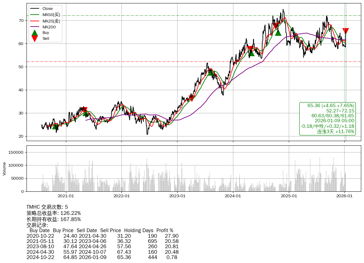 | 23 | TMHC | $65.35(+4.62 +7.61%) 01-09 14:59 60.72 01-08 | 📈涨破 MA100/200 均线 📈连涨3天 +11.76% 📉回撤 2024-11-25 -12.65% (409天) 74.82(2024-11-24)→54.00(2025-04-07) | +126.22% | +167.85% | -41.62% | 5 | 中性/0.32/1.18 | 2020-07-27~2026-01-09 |