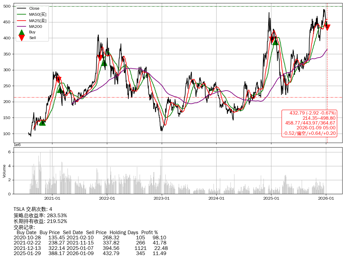 | 7 | ★TSLA | $444.99(+9.15 +2.10%) 01-09 14:59 435.84 01-08 | 📉回撤 2025-12-16 -11.64% (23天) 489.79(2025-12-15)→431.39(01-06) | +283.53% | +219.52% | +64.01% | 4 | 偏空/0.64/0.20 | 2020-07-27~2026-01-09 |