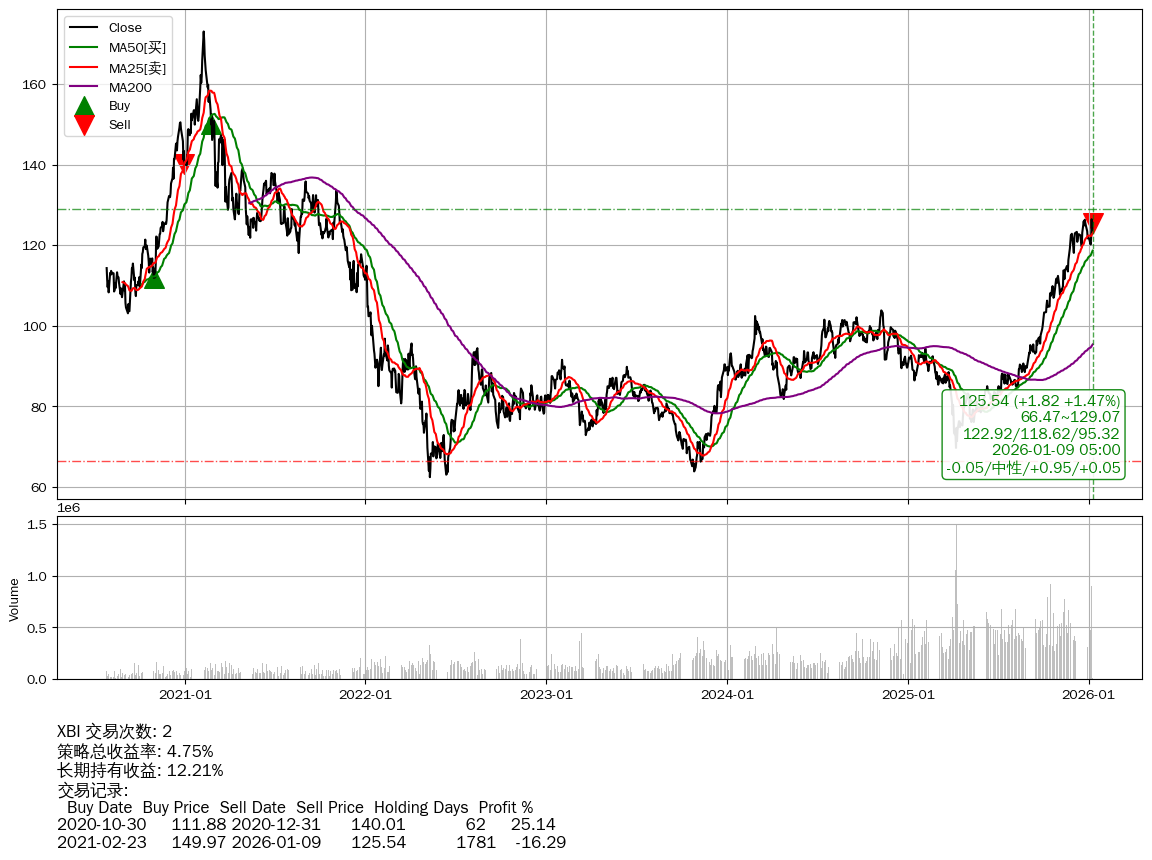 | 38 | ★XBI | $124.47(+0.77 +0.62%) 01-09 14:59 123.70 01-08 | 📉回撤 2021-02-08 -27.45% (1795天) 173.03(2021-02-07)→62.39(2022-05-10) | +4.75% | +12.21% | -7.45% | 2 | 中性/0.95/0.05 | 2020-07-27~2026-01-09 |