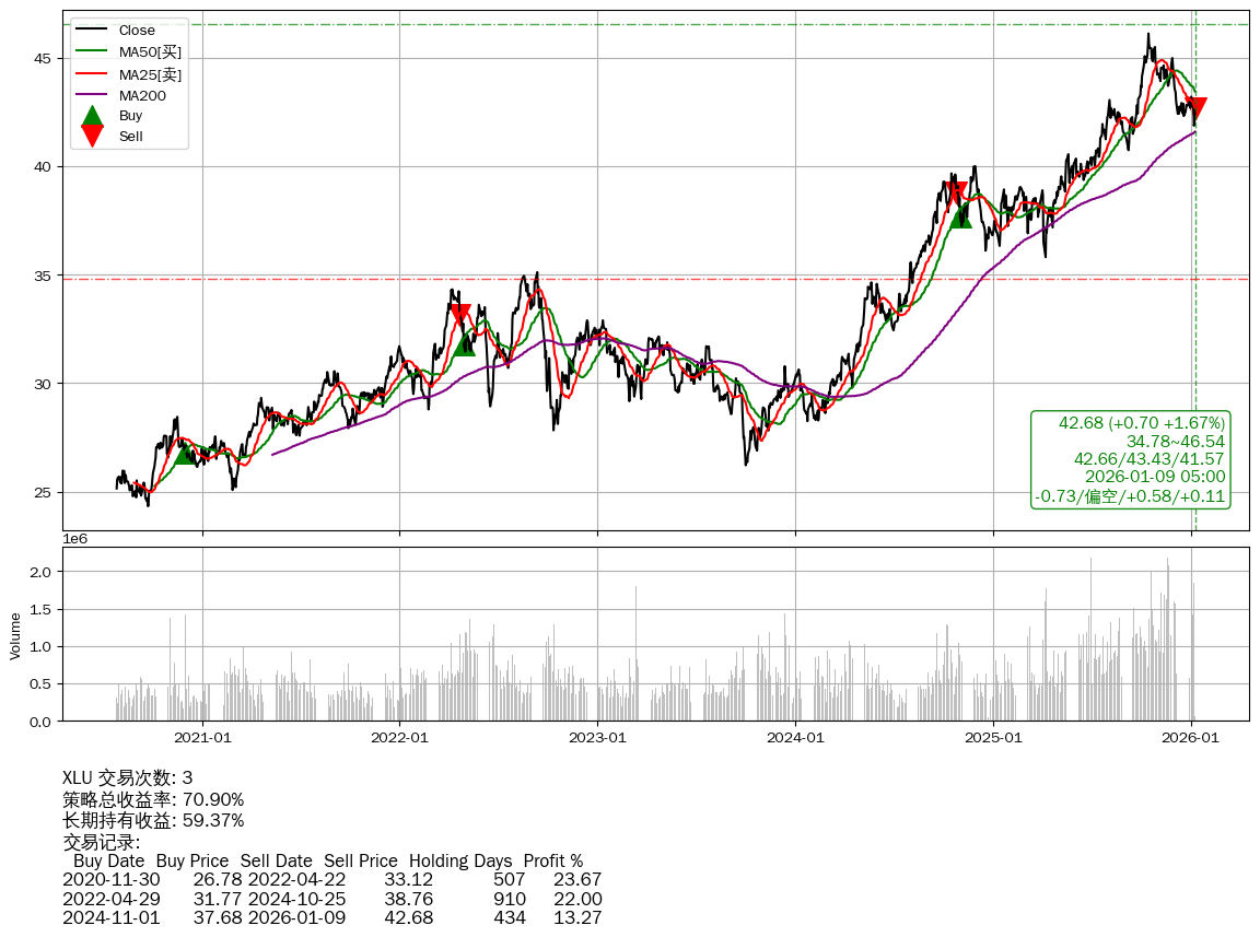 | 29 | ★XLU | $42.50(+0.51 +1.21%) 01-09 14:59 41.99 01-08 | 📈涨破 MA5/10/25 均线 📉回撤 2025-10-15 -7.42% (85天) 46.10(2025-10-14)→41.85(01-06) | +70.90% | +59.37% | +11.53% | 3 | 偏空/0.58/0.11 | 2020-07-27~2026-01-09 |