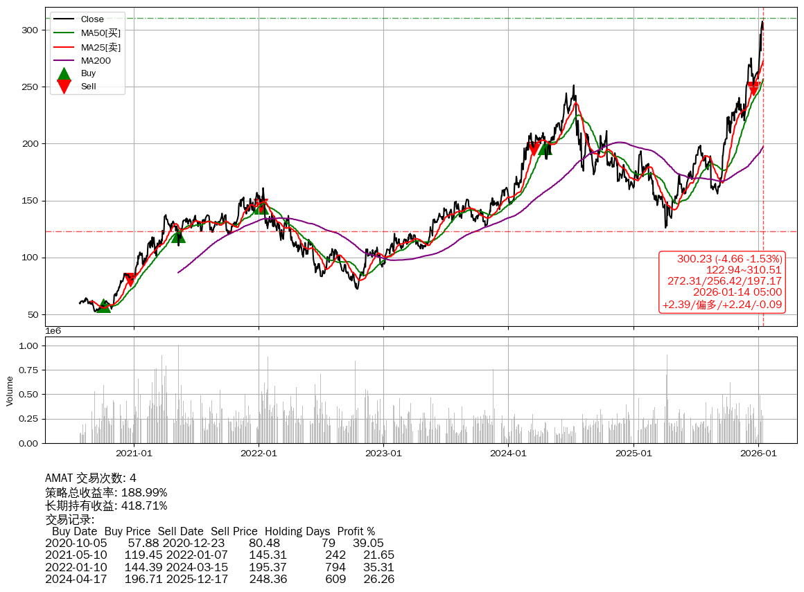 | 13 | ★AMAT | $301.88(-2.96 -0.97%) 01-14 14:59 304.84 01-13 | 📉回撤 01-12 -2.32% (1天) 307.36(01-11)→300.23(01-13) | +188.99% | +418.71% | -229.72% | 4 | 偏多/2.22/-0.09 | 2020-07-27~2026-01-14 |