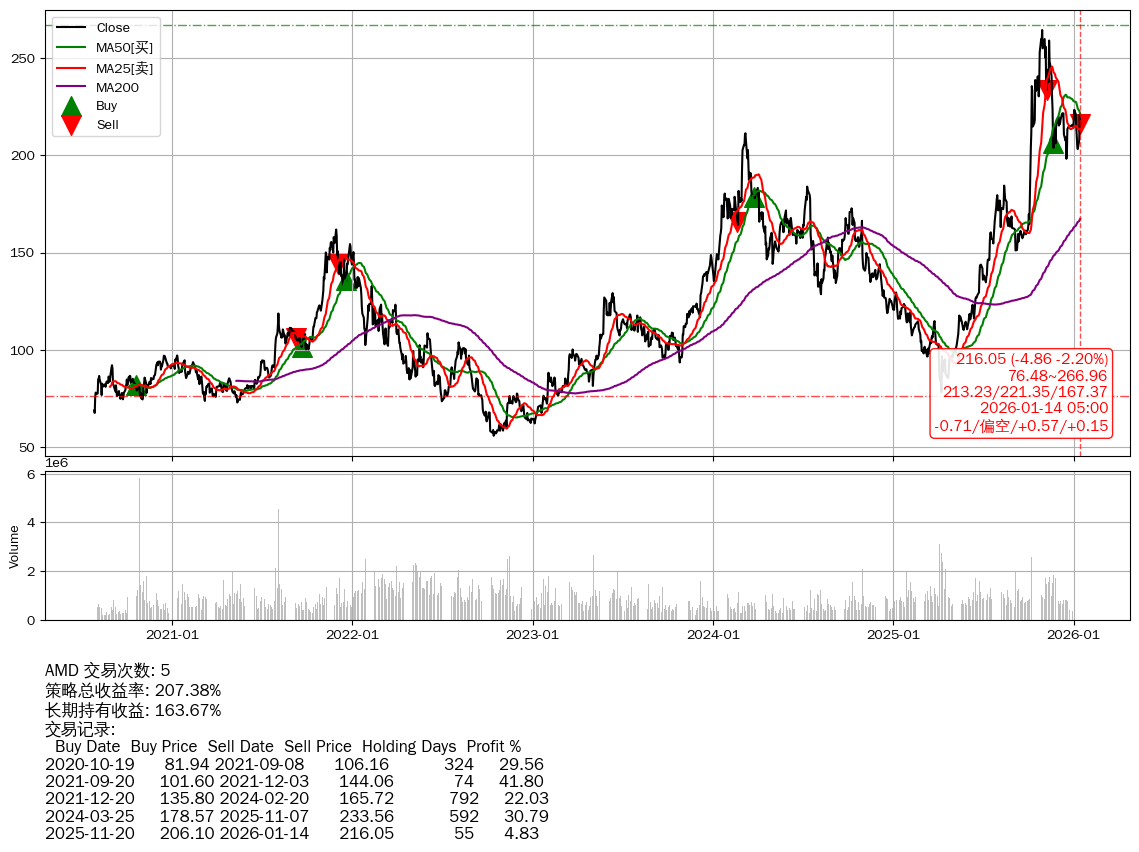 | 11 | ★AMD | $223.53(+2.51 +1.14%) 01-14 14:59 221.02 01-13 | 📉回撤 2025-10-29 -18.26% (76天) 264.31(2025-10-28)→198.20(2025-12-16) | +207.38% | +163.67% | +43.71% | 5 | 偏空/0.57/0.15 | 2020-07-27~2026-01-14 |