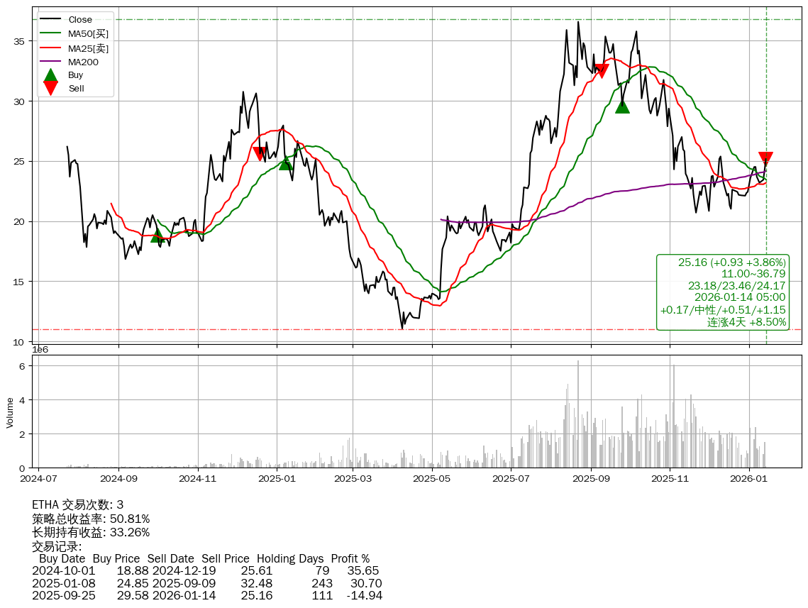 | 36 | ★ETHA | $25.59(+1.36 +5.61%) 01-14 14:59 24.23 01-13 | 📈连涨4天 +8.50% 📉回撤 2025-08-24 -31.22% (142天) 36.58(2025-08-21)→20.70(2025-11-20) | +50.81% | +33.26% | +17.54% | 3 | 中性/0.51/1.15 | 2024-07-23~2026-01-14 |