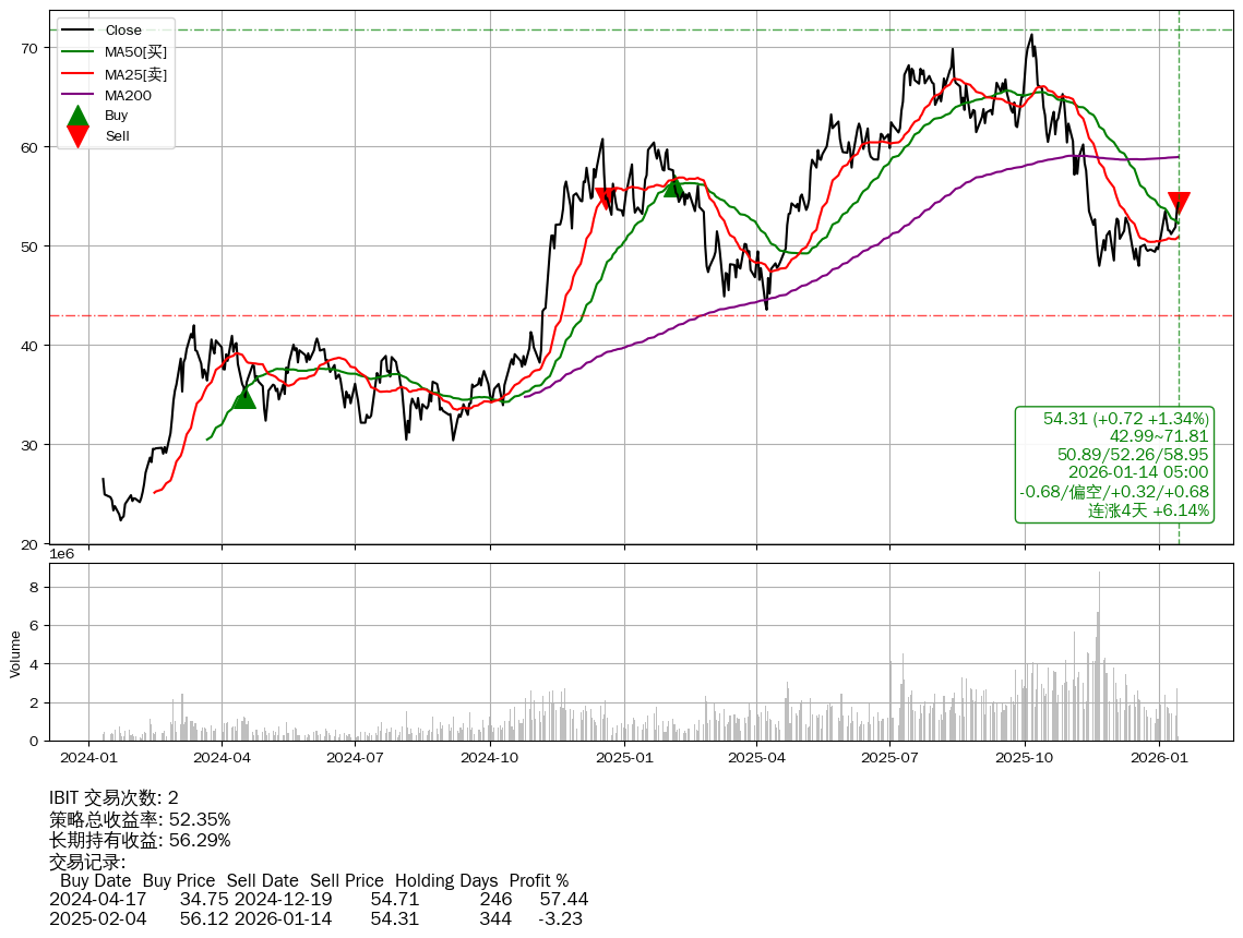 | 35 | ★IBIT | $55.44(+1.85 +3.45%) 01-14 14:59 53.59 01-13 | 📈连涨4天 +6.14% 📉回撤 2025-10-06 -23.82% (99天) 71.29(2025-10-05)→47.98(2025-11-20) | +52.35% | +56.29% | -3.93% | 2 | 偏空/0.32/0.68 | 2024-01-11~2026-01-14 |