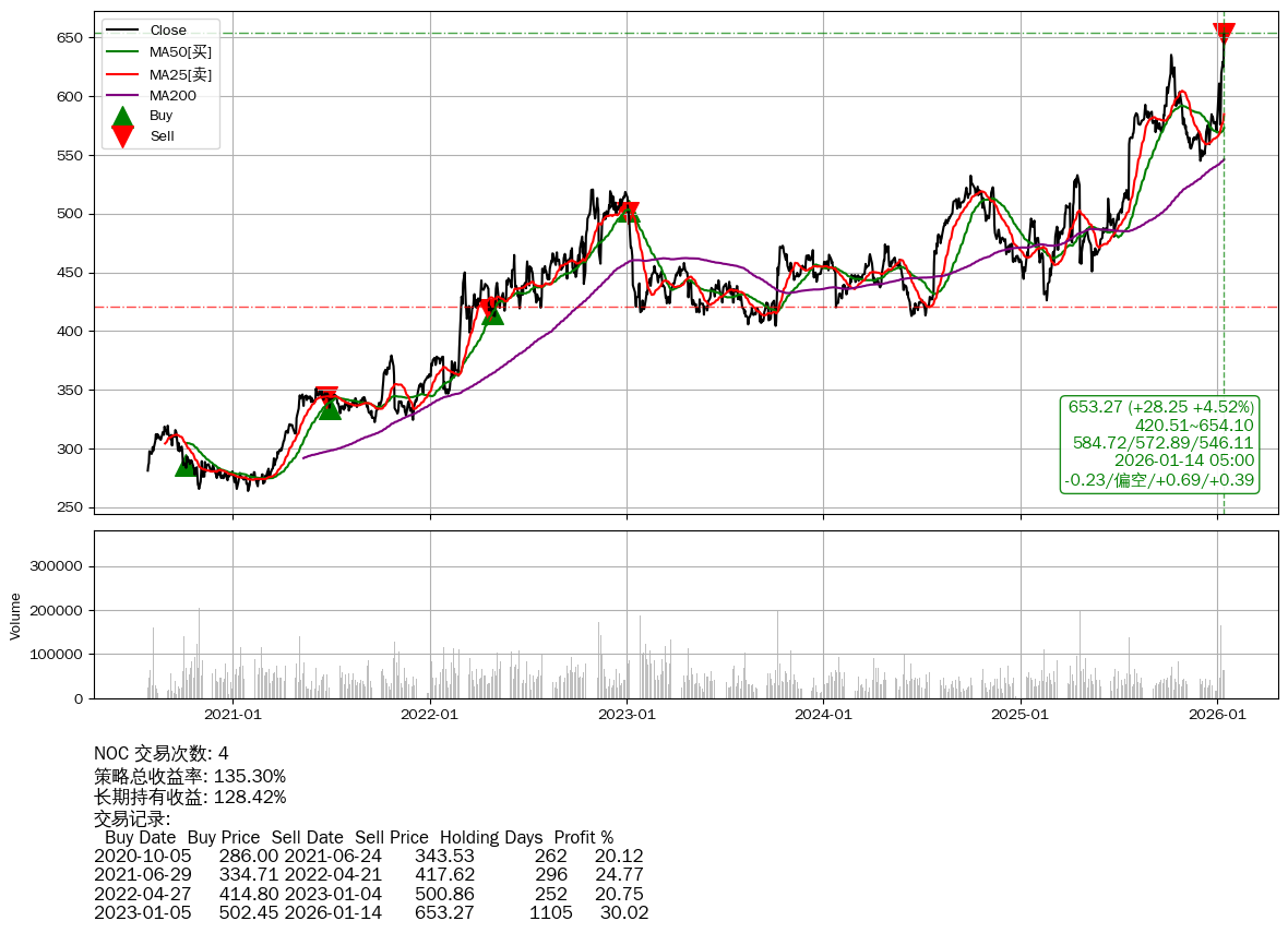 | 20 | 🟢NOC | $653.30(+28.09 +4.49%) 01-14 14:59 625.21 01-13 | 📈涨破 52周高点 (654.10) | +135.30% | +128.42% | +6.88% | 4 | 偏空/0.69/0.39 | 2020-07-27~2026-01-14 |