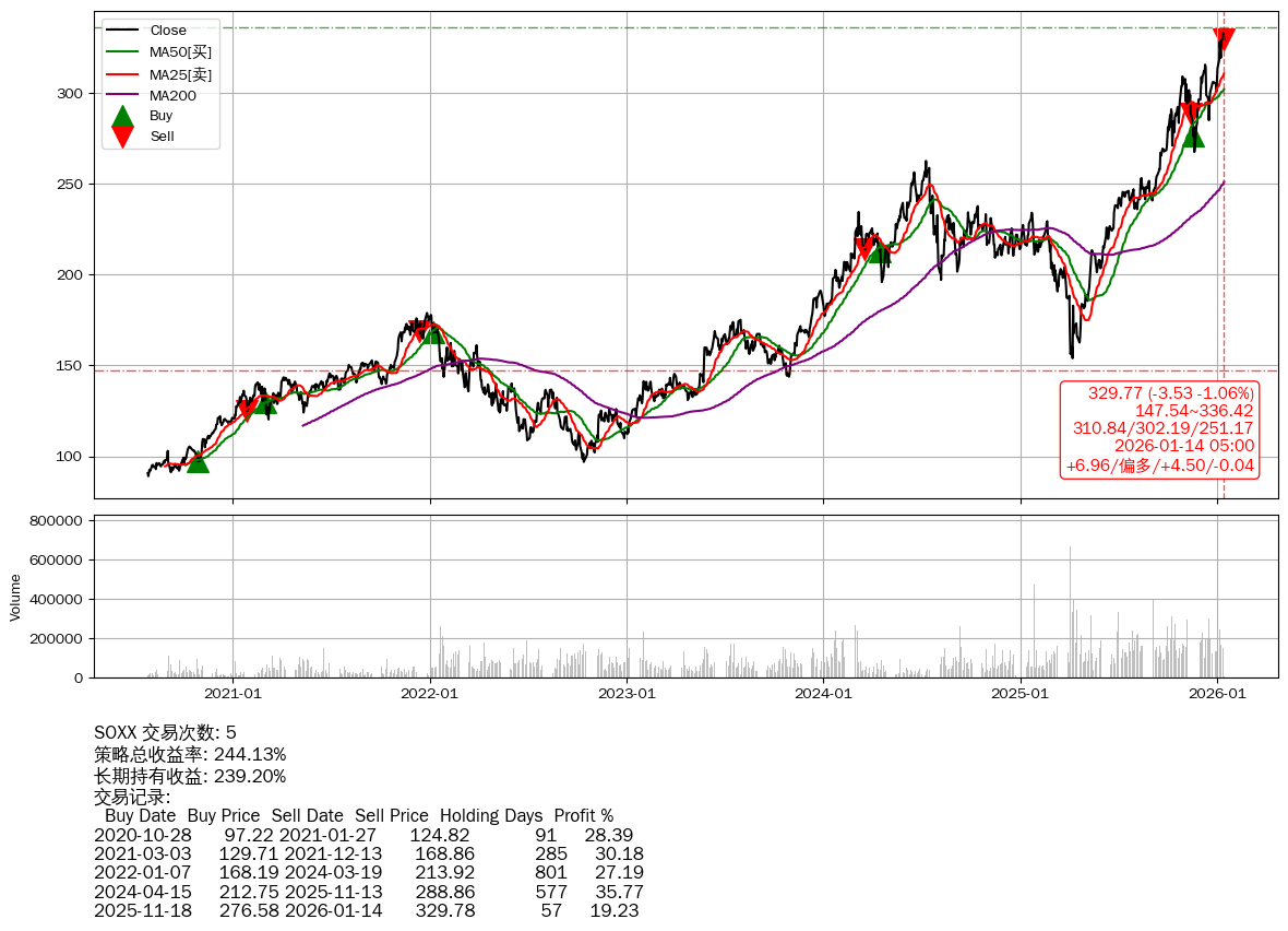 | 10 | ★SOXX | $331.93(-1.35 -0.41%) 01-14 14:59 333.28 01-13 | 📉回撤 01-13 -1.06% (0天) 333.30(01-12)→329.77(01-13) | +244.13% | +239.20% | +4.92% | 5 | 偏多/4.69/-0.04 | 2020-07-27~2026-01-14 |