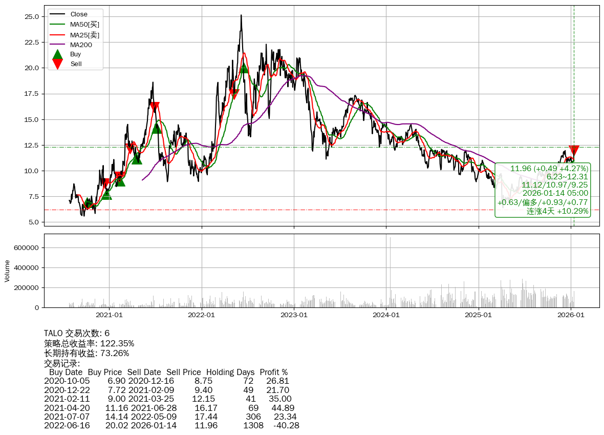 | 26 | TALO | $11.97(+0.50 +4.36%) 01-14 14:59 11.47 01-13 | 📈涨破 52周高点 (12.31) 📈连涨4天 +10.29% 📉回撤 2022-06-07 -52.47% (1316天) 25.15(2022-06-06)→6.38(2025-04-07) | +122.35% | +73.26% | +49.09% | 6 | 偏多/0.9/0.77 | 2020-07-27~2026-01-14 |