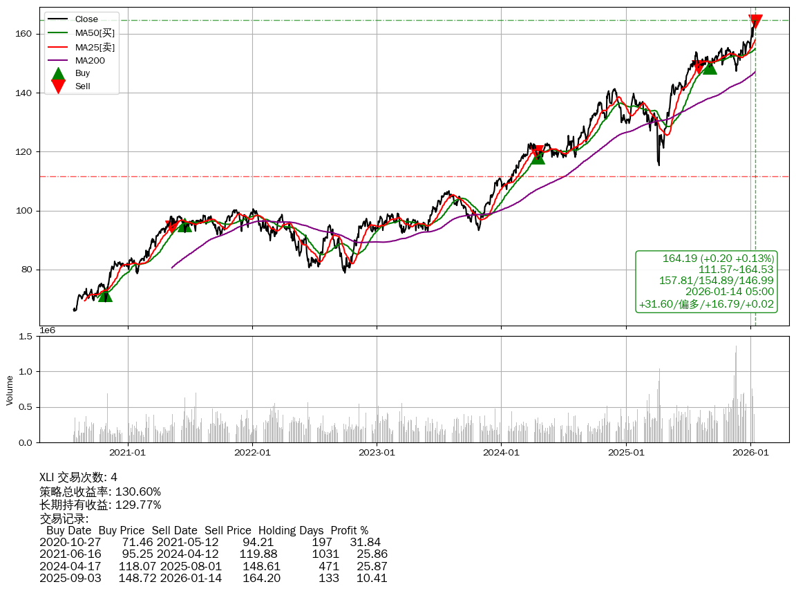 | 21 | ★XLI | $164.27(+0.28 +0.17%) 01-14 14:59 163.99 01-13 | +130.60% | +129.77% | +0.83% | 4 | 偏多/16.79/0.02 | 2020-07-27~2026-01-14 | |