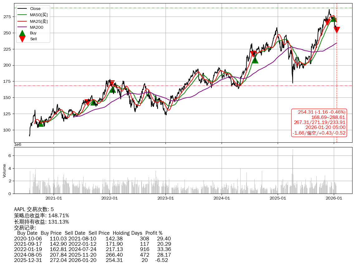| 19 | ★AAPL | $246.69(-8.79 -3.44%) 01-20 14:59 255.48 01-16 | 📉回撤 2025-12-02 -11.11% (48天) 286.09(2025-12-01)→254.31(01-19) | +148.71% | +131.13% | +17.58% | 5 | 偏空/0.43/-0.52 | 2020-07-27~2026-01-20 |