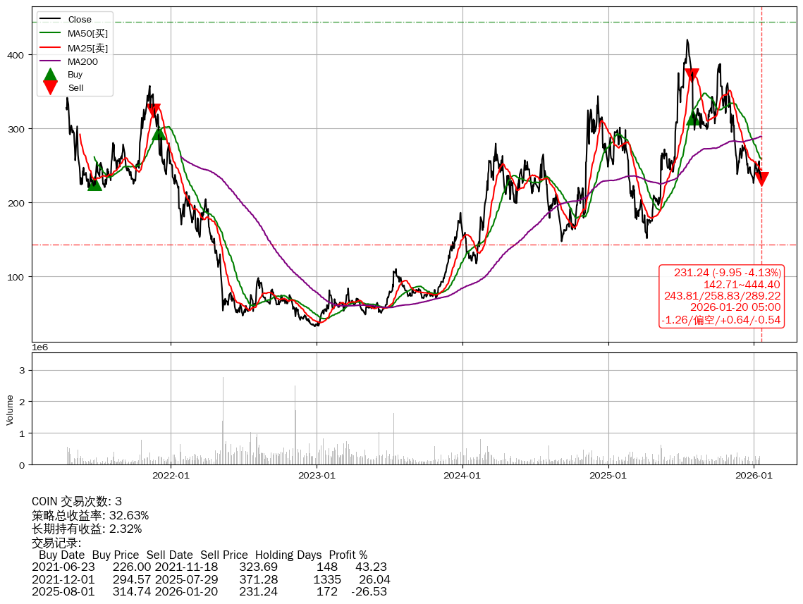 | 35 | ★COIN | $227.88(-13.27 -5.50%) 01-20 14:59 241.15 01-16 | 📉回撤 2025-07-20 -44.94% (183天) 419.98(2025-07-17)→226.13(2025-12-30) | +32.63% | +2.32% | +30.31% | 3 | 偏空/0.64/-0.54 | 2021-04-14~2026-01-20 |