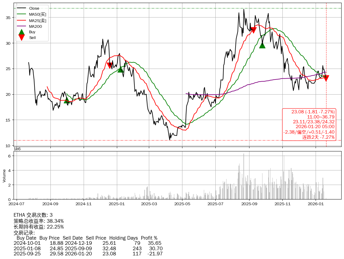 | 34 | ★ETHA | $22.67(-2.20 -8.84%) 01-20 14:59 24.88 01-16 | 📉跌破 MA5/10/25/50/200 均线 📉连跌2天 -7.27% 📉回撤 2025-08-24 -36.91% (148天) 36.58(2025-08-21)→20.70(2025-11-20) | +38.34% | +22.25% | +16.10% | 3 | 偏空/0.51/-1.40 | 2024-07-23~2026-01-20 |