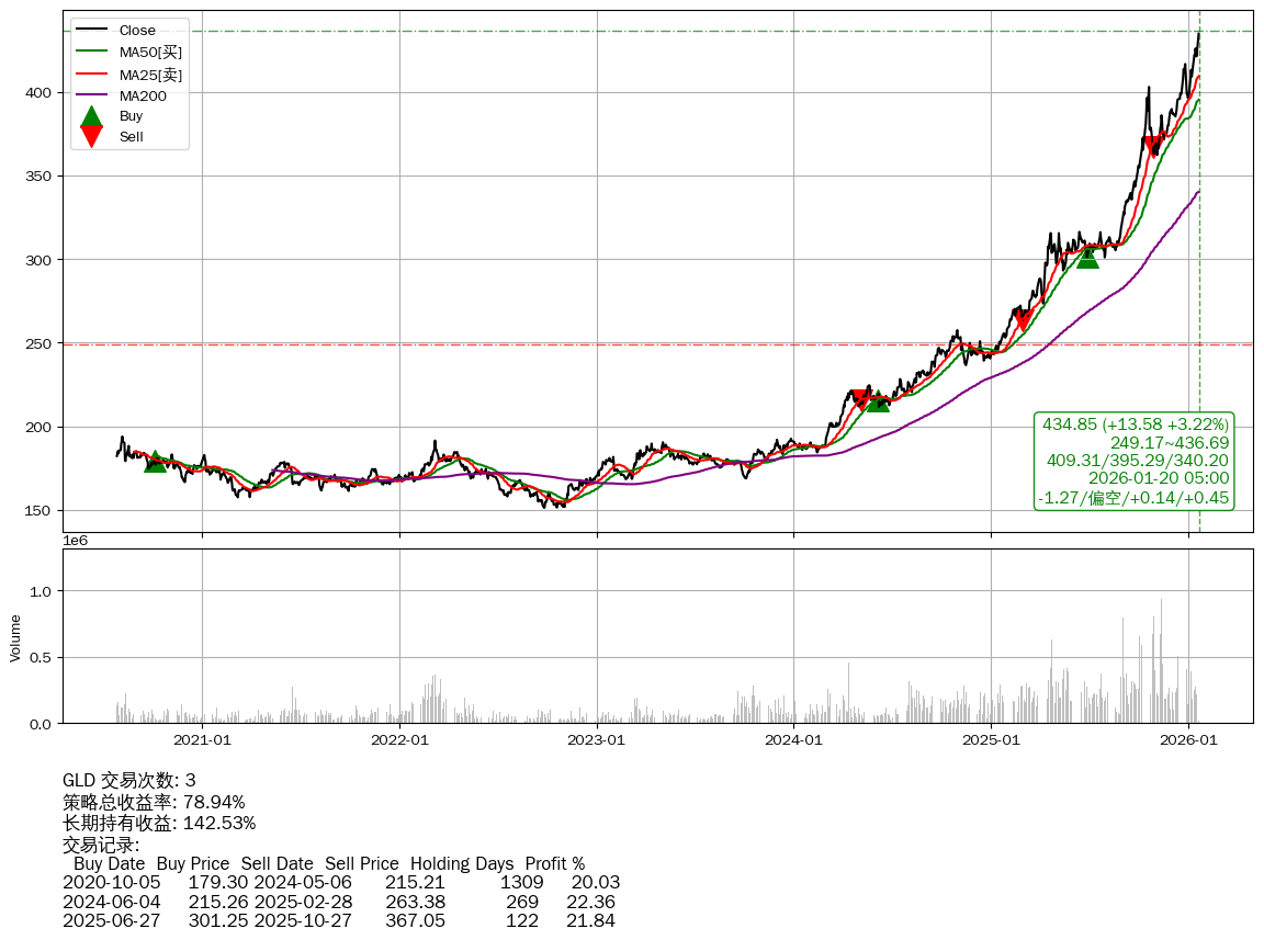| 27 | ★GLD | $437.29(+16.07 +3.82%) 01-20 14:59 421.22 01-16 | 📈涨破 MA5 均线 📈涨破 52周高点 (436.69) | +78.94% | +142.53% | -63.58% | 3 | 偏空/0.14/0.45 | 2020-07-27~2026-01-20 |
