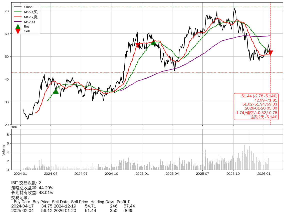 | 33 | ★IBIT | $50.77(-3.45 -6.36%) 01-20 14:59 54.22 01-16 | 📉跌破 MA5/10/50 均线 📉连跌2天 -5.14% 📉回撤 2025-10-06 -27.85% (105天) 71.29(2025-10-05)→47.98(2025-11-20) | +44.29% | +48.01% | -3.72% | 2 | 偏空/0.52/-0.78 | 2024-01-11~2026-01-20 |