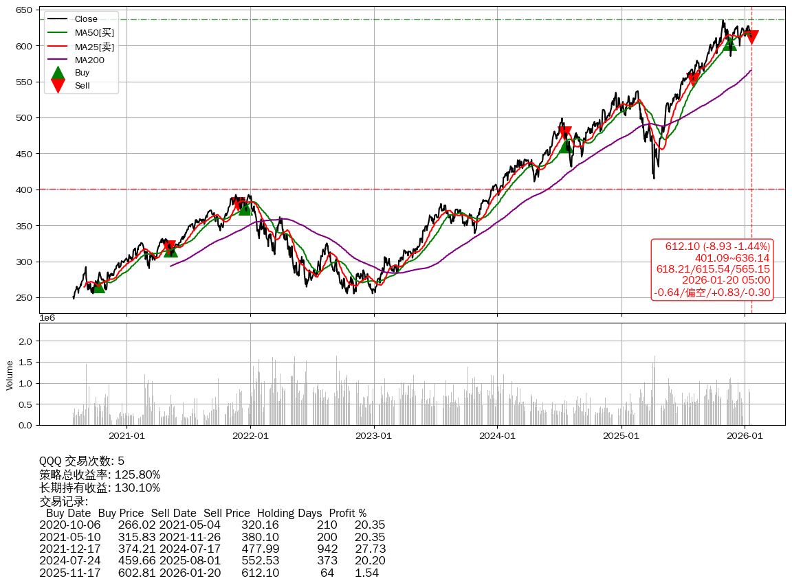 | 22 | ★QQQ | $608.04(-13.01 -2.09%) 01-20 14:59 621.05 01-16 | 📉跌破 MA5/25/50 均线 📉回撤 2025-10-29 -3.62% (82天) 635.06(2025-10-28)→585.07(2025-11-19) | +125.80% | +130.10% | -4.29% | 5 | 偏空/0.83/-0.30 | 2020-07-27~2026-01-20 |