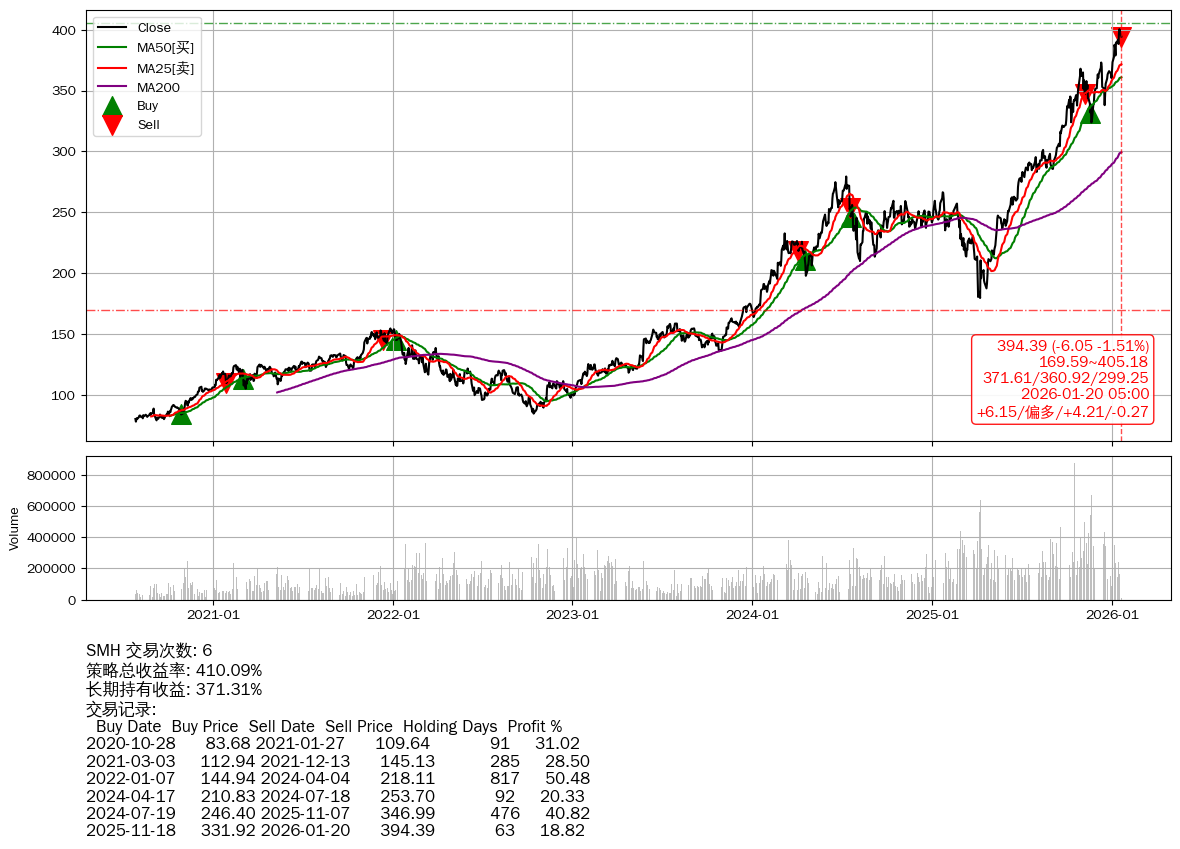 | 5 | ★SMH | $390.29(-10.13 -2.53%) 01-20 14:59 400.42 01-16 | 📉回撤 01-19 -1.51% (0天) 400.44(01-15)→394.39(01-19) | +410.09% | +371.31% | +38.78% | 6 | 偏多/4.2/-0.27 | 2020-07-27~2026-01-20 |