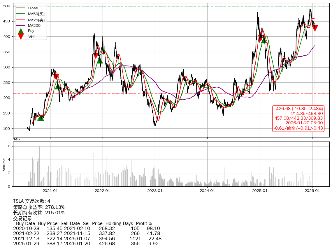 | 9 | ★TSLA | $419.25(-18.22 -4.16%) 01-20 14:59 437.47 01-16 | 📉跌破 MA100 均线 📉回撤 2025-12-16 -12.89% (34天) 489.79(2025-12-15)→426.68(01-19) | +278.13% | +215.01% | +63.12% | 4 | 偏空/0.91/-0.43 | 2020-07-27~2026-01-20 |