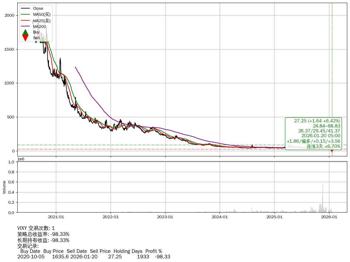 | 37 | ★VIXY | $28.45(+2.82 +11.00%) 01-20 14:59 25.63 01-16 | 📈涨破 MA5/10/25 均线 📈连涨3天 +6.70% 📉回撤 2020-09-03 -98.69% (1964天) 2078.40(2020-09-02)→24.95(01-08) | -98.33% | -98.33% | +0.00% | 1 | 偏多/0.15/3.56 | 2020-07-27~2026-01-20 |
