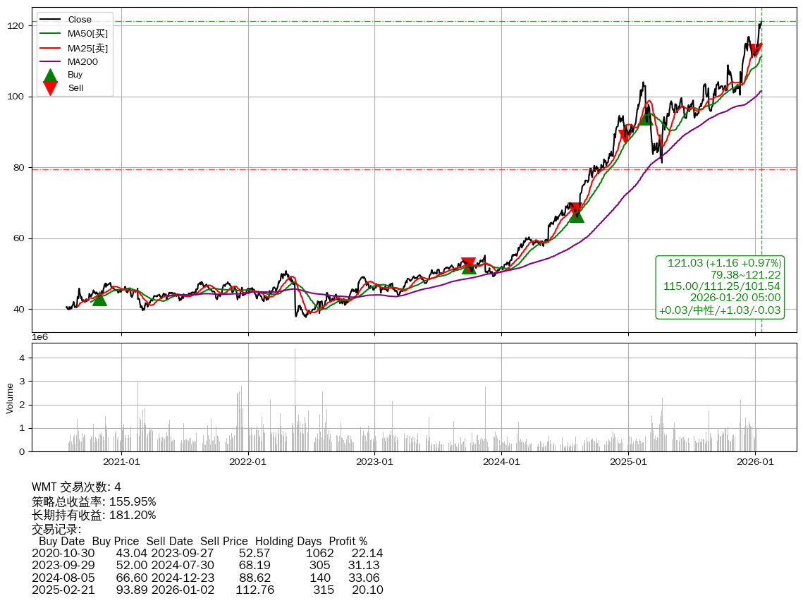 | 14 | ★WMT | $118.75(-1.25 -1.04%) 01-20 14:59 120.00 01-16 | 📈涨破 MA5 均线 | +155.95% | +181.20% | -25.26% | 4 | 中性/1.03/-0.03 | 2020-07-27~2026-01-20 |