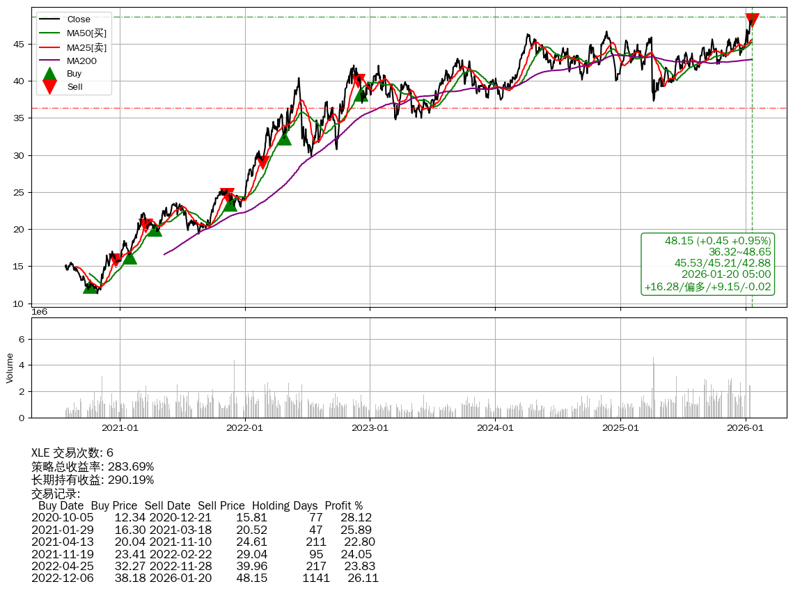 | 8 | ★XLE | $47.60(-0.09 -0.19%) 01-20 14:59 47.69 01-16 | 📈涨破 MA5 均线 | +283.69% | +290.19% | -6.51% | 6 | 偏多/9.16/-0.02 | 2020-07-27~2026-01-20 |