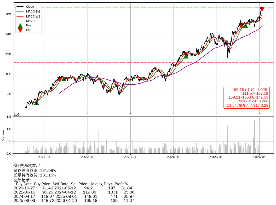 | 20 | ★XLI | $163.57(-3.32 -1.99%) 01-20 14:59 166.89 01-16 | 📉跌破 MA5 均线 📉回撤 01-19 -1.02% (0天) 166.89(01-15)→165.18(01-19) | +131.98% | +131.15% | +0.83% | 4 | 偏多/7.91/-0.28 | 2020-07-27~2026-01-20 |