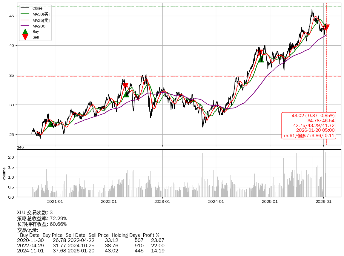 | 28 | ★XLU | $42.95(-0.44 -1.01%) 01-20 14:59 43.40 01-16 | 📉跌破 MA5/50/100 均线 📉回撤 2025-10-15 -6.67% (96天) 46.10(2025-10-14)→41.85(01-06) | +72.29% | +60.66% | +11.63% | 3 | 偏多/3.86/-0.11 | 2020-07-27~2026-01-20 |