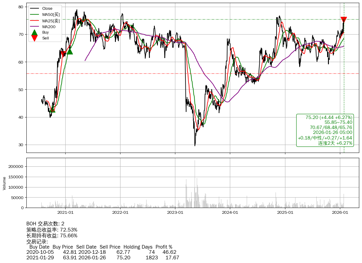 | 30 | 🟢BOH | $75.07(+4.29 +6.06%) 01-26 14:59 70.78 01-23 | 📈涨破 MA5/10 均线 📈涨破 52周高点 (75.40) 📈连涨2天 +6.27% 📉回撤 2021-03-21 -4.71% (1771天) 78.92(2021-03-18)→29.54(2023-05-11) | +72.53% | +75.66% | -3.13% | 2 | 中性/0.27/1.64 | 2020-07-27~2026-01-26 |