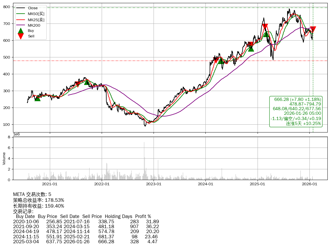 | 14 | ★META | $672.32(+13.57 +2.06%) 01-26 14:59 658.75 01-23 | 📈连涨5天 +10.25% 📉回撤 2025-08-12 -15.51% (166天) 788.62(2025-08-11)→588.67(2025-11-19) | +178.53% | +159.40% | +19.13% | 5 | 偏空/0.34/0.19 | 2020-07-27~2026-01-26 |