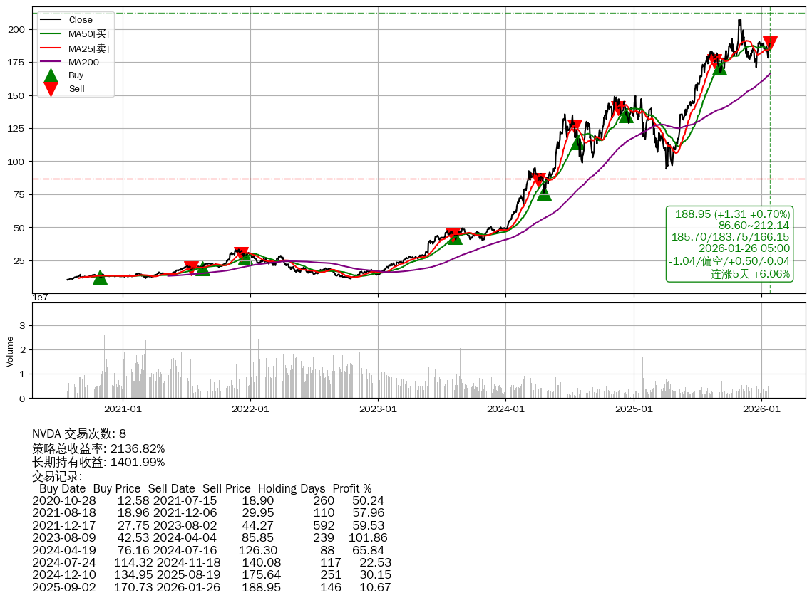 | 1 | ★NVDA | $186.39(-1.28 -0.68%) 01-26 14:59 187.67 01-23 | 📈连涨5天 +6.06% 📉回撤 2025-10-29 -8.73% (88天) 207.02(2025-10-28)→170.98(2025-12-16) | +2136.82% | +1401.99% | +734.83% | 8 | 偏空/0.5/-0.04 | 2020-07-27~2026-01-26 |