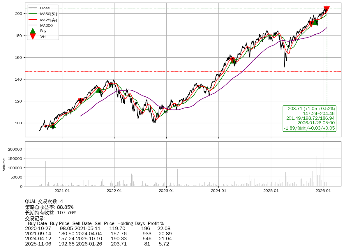 | 25 | ★QUAL | $203.71(+1.04 +0.51%) 01-26 14:59 202.67 01-23 | 📈涨破 MA10 均线 📉回撤 01-12 -0.26% (13天) 204.25(01-11)→199.53(01-19) | +88.85% | +107.76% | -18.91% | 4 | 偏空/0.03/0.05 | 2020-07-27~2026-01-26 |