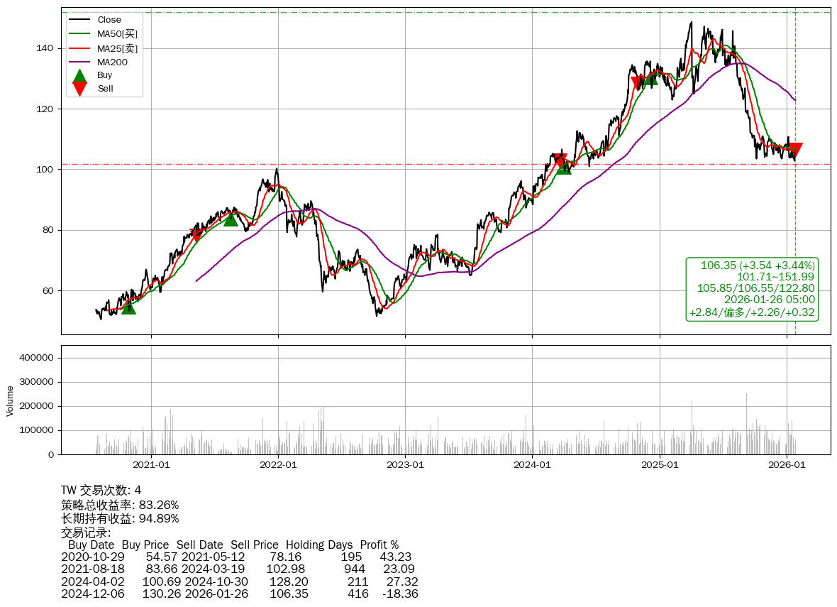 | 28 | 🟢TW | $106.28(+3.41 +3.31%) 01-26 14:59 102.87 01-23 | 📈涨破 MA5/10/25 均线 📉回撤 2025-04-03 -28.45% (297天) 148.64(2025-04-02)→102.81(01-22) | +83.26% | +94.89% | -11.63% | 4 | 偏多/2.26/0.32 | 2020-07-27~2026-01-26 |