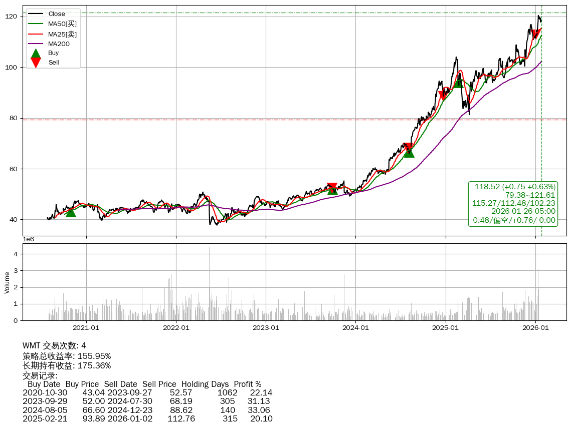 | 16 | ★WMT | $117.65(-0.12 -0.10%) 01-26 14:59 117.77 01-23 | 📈涨破 MA5 均线 📉回撤 01-13 -1.55% (12天) 120.38(01-12)→117.77(01-22) | +155.95% | +175.36% | -19.41% | 4 | 偏空/0.76/-0.00 | 2020-07-27~2026-01-26 |