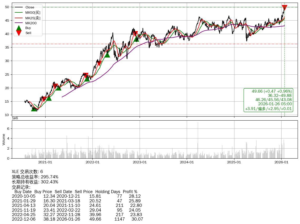 | 7 | ★XLE | $49.21(+0.02 +0.04%) 01-26 14:59 49.19 01-23 | +295.74% | +302.43% | -6.69% | 6 | 偏多/2.93/0.01 | 2020-07-27~2026-01-26 | |
